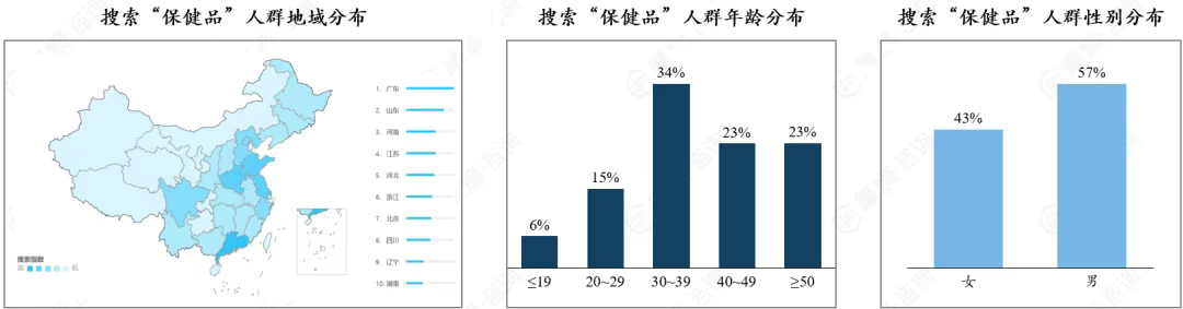 保健品用户搜索行为数据显示,地域、年龄与性别维度呈现显著特征。从地域分布来看,广东、山东、河南、江苏等地成为主动搜索保健品的核心区域,这些省份人口基数庞大。