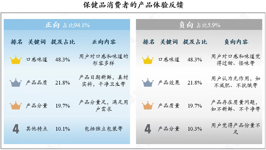 消费者整体购买体验较优。通过对购后评论进行分析,发现正向评价占比高达94.1%。具体来看,口感味道是消费者最直接的感受和最关心的内容,因此商家在保证功效的同时,也应重点研究消费者口味感受。