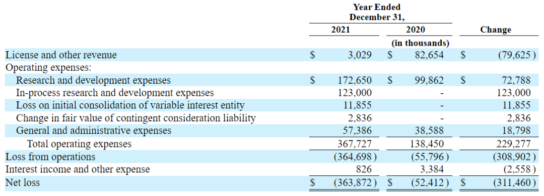 Relay在2020年已确认完成与基因泰克合作相关的8500万美元预付款收入,2021年公司仅从基因泰克获得300万美元的研发服务费用,且是公司全年主要收入。2021年公司研发费用为1.727亿美元,主要受员工增加、外部研发费用和临床试验费用增加的影响;一般及行政开支为5740万美元,主要是由于员工成本增加;全年净亏损为3.639亿美元,摊薄每股净亏损3.82美元,净亏损增加主要与2021年收购ZebiAI相关的一次性费用1.349亿美元有关。