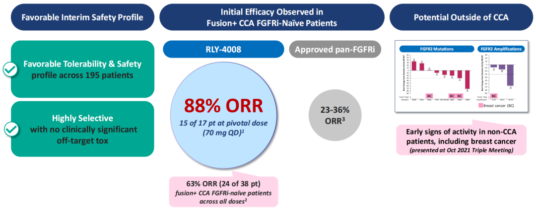 RLY-4008是一种选择性成纤维细胞生长因子受体2(FGFR2)口服小分子抑制剂。FGFR2是一种在某些癌症中经常发生突变的受体酪氨酸激酶,是FGFR家族的四个成员之一,这组蛋白具有高度相似的蛋白质序列和特性。当前一些非选择性泛FGFR抑制剂已在携带FGFR2基因融合的肝内胆管癌(CCA)患者中证明了临床概念验证,但由于这些疗法同时对FGFR1和FGFR4具有抑制性,会不可避免地引起高磷酸血症和腹泻等副作用。