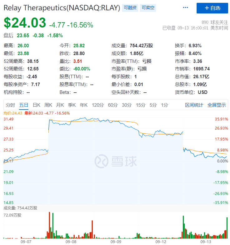 9月8日,受公司披露RLY-4008积极临床数据影响,Relay当日股价上涨超23%,但在9月13日,公司股价急跌16.56%。9月12日,Relay宣布增发价值约3亿美元的普通股。