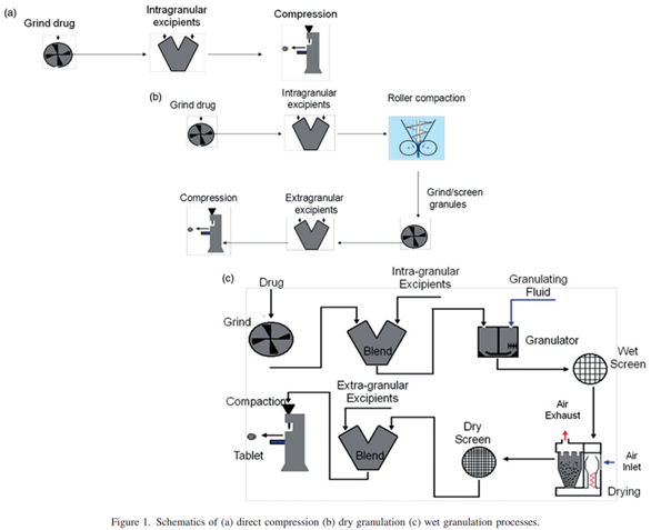 图1三种主要的通用口服固体制剂工艺路线(参考文献1)