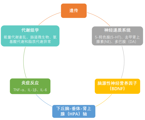 抑郁症并非简单的功能性精神障碍,而是一种涉及遗传、心理、生物化学和社会环境等因素的疾病,基于此也形成了从不同角度阐述抑郁症病理机制的假说,主要有: