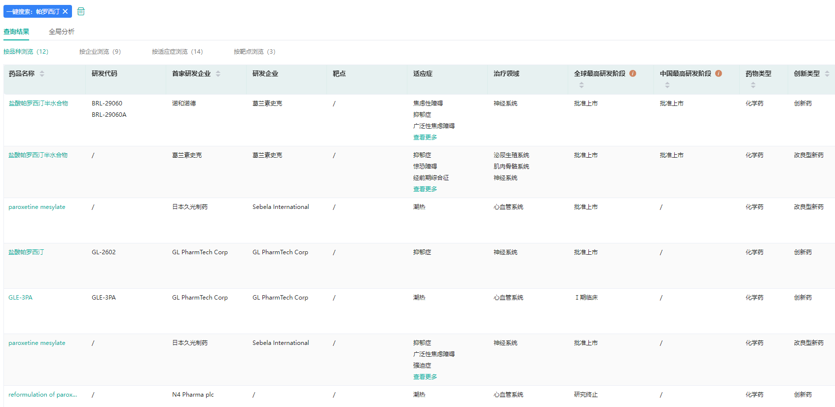 帕罗西汀全球药物研发情况(部分)(微信搜索"药融云小程序"进行更多数据查询)