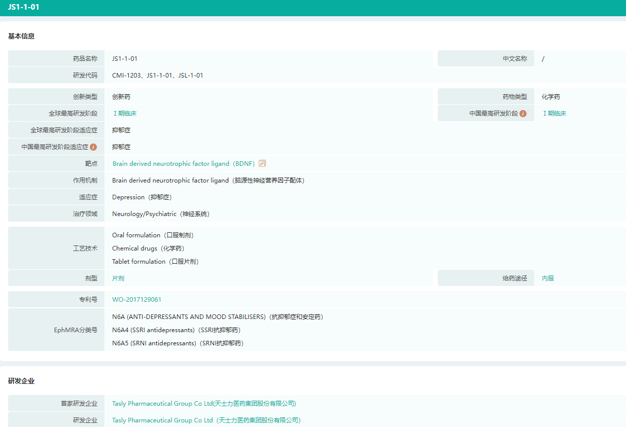 天力士抑郁症药物JS1-1-01基本信息(部分)