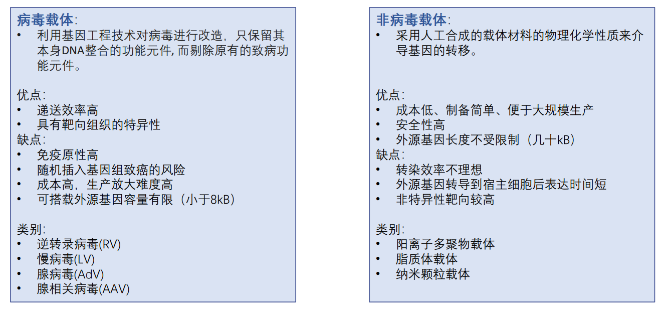 目前基因治疗过程中用到的载体系统主要分为两类:一类是病毒类载体,另一类是非病毒类的载体。其中,约70%的基因治疗方案都采用病毒作为递送载体。最常见的病毒载体有逆转录病毒、腺相关病毒、腺病毒和慢病毒等。不同于病毒载体,非病毒载体纳米级别的粒径有助于实现载体的靶向性和有效性。但两者最终目的都是制备一个无毒、高效、低免疫原性、可靶向的外源基因递送解决方案。因而仍需投入更多的研究在寻求更好的载体上,开发新型的载体将会为全球基因治疗市场的发展提供更为有力的帮助。