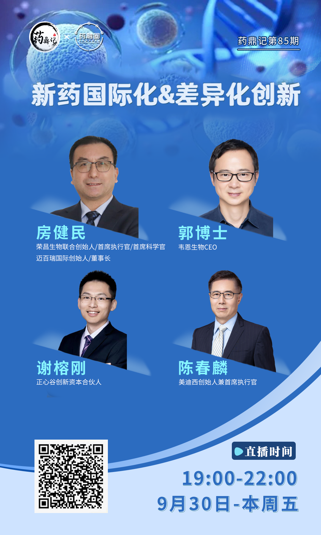 2022年9月30日(周五)晚,药鼎记将邀请荣昌生物联合创始人、首席执行官、兼首席科学官;迈百瑞国际创始人、董事长房健民、韦恩生物CEO郭博士、正心谷创新资本合伙人谢榕刚以及美迪西创始人兼首席执行官陈春麟,共同探讨新药国际化战略。