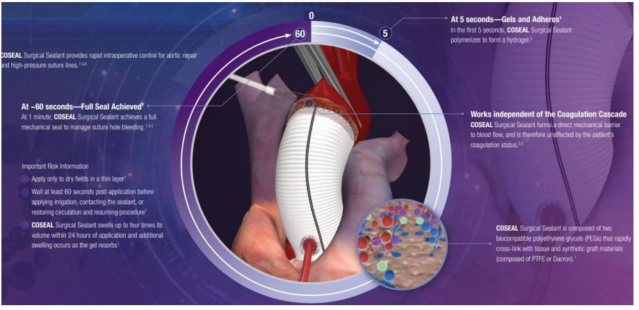 以Baxter的已上市产品CoSeal为例,其凝胶部分由聚乙二醇和聚乙烯组成,在喷射到组织表面时,可与组织表面的蛋白迅速交联,并形成机械粘附,快速密封血管缝合处,应用于肺部手术时可减少肺漏气现象。