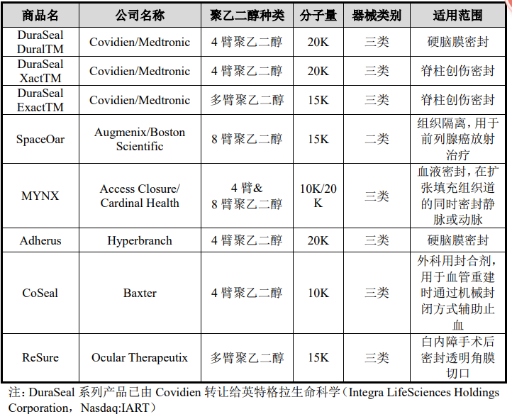 在国际市场,已有多款聚乙二醇修饰的医疗器械产品上市,例如:Covidien(美敦力旗下企业)的DuraSeal产品(已转让给英特格拉生命科学)、Cardinal Health的Mynx产品、Augmenix(波士顿科学旗下企业)的SpaceOAR产品和百特(Baxter)的CoSeal产品等。欧美市场上主要的聚乙二醇凝胶类医疗器械产品如下所示: