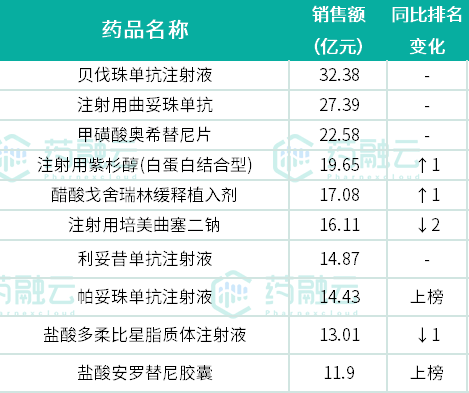 2022年H1抗癌药物市场院内销售TOP10