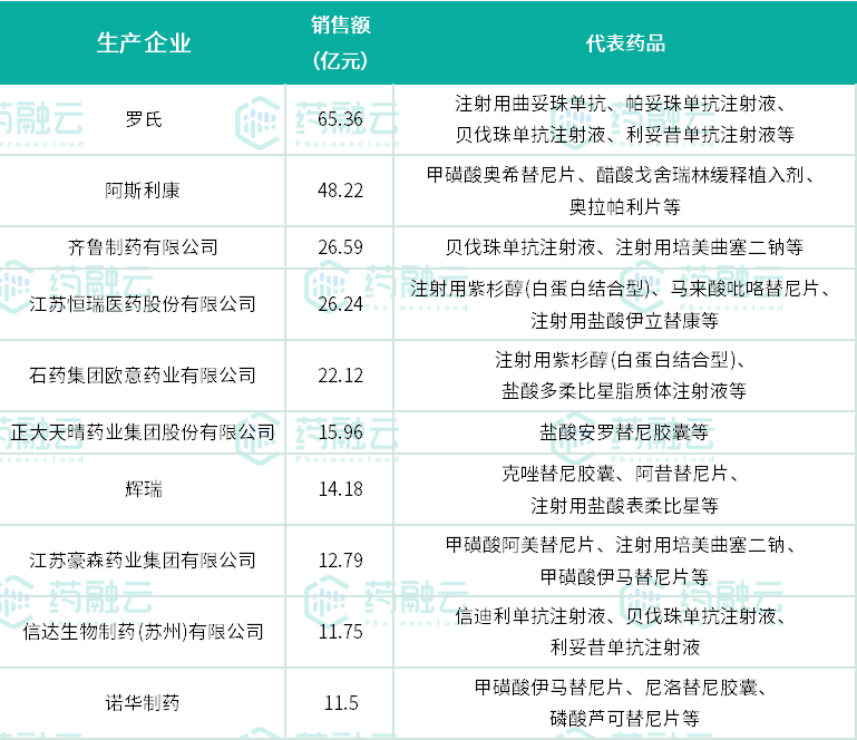 2022年H1抗癌药物市场院内生产企业TOP10