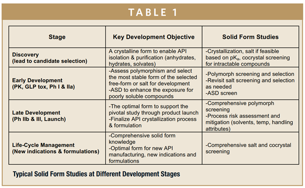 理想上是从一而终,现实仍然具有挑战,包括早期API的可及性,API开发工艺的不确定性以及API物理性质的不断转变性等。每个候选药物都是独一无二的,但是,其固态形式确实多种多样的,在药物开发过程中选择策略会有所不同。表1概述了在不同的开发阶段,如何进行API固态研究以实现特定的开发目标。在早期阶段,重点是确定合适的晶型以支持API的分离和纯化,并为临床前和临床研究提供具有足够溶解度和稳定性的原料药。随着开发的进展,在后期阶段会进行额外的研究,以评估和消除API和制剂生产过程中的固态形式风险,以增加对固态形式的了解,并通过为新适应症和处方选择最佳固态形式。下文我们谈谈固态形式转变的几种情形: