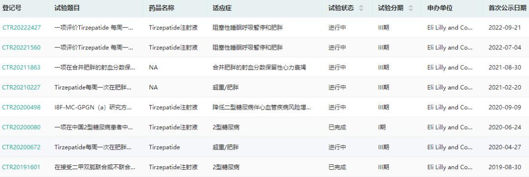 tirzepatide临床试验信息(微信搜索"药融云小程序"进行相关更多数据查询)