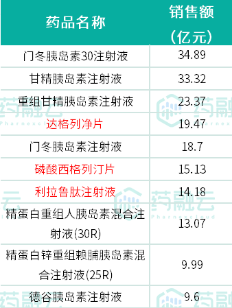 2021年糖尿病药物市场的院内销售额TOP10品种