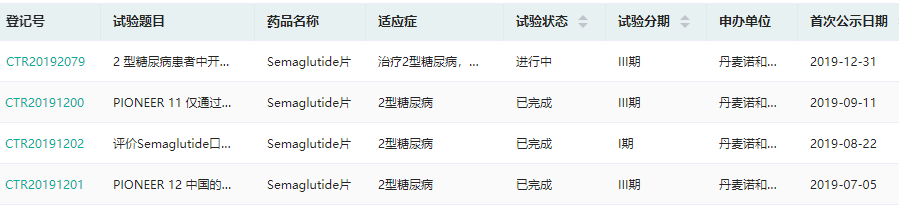 5月27日,诺和诺德的司美格鲁肽片上市申请获CDE受理。司美格鲁肽是一款GLP-1受体激动剂,其注射剂已在国内获批上市,片剂已在海外获批用于成人2型糖尿病患者的血糖控制,为全球第一个上市的口服GLP-1受体激动剂药物(GLP-1RA)。据药融云数据库,司美格鲁肽片剂对比安慰剂或西格列汀治疗2型糖尿病患者的两项III期临床试验均已完成,推测此次申报的适应症为治疗2型糖尿病。