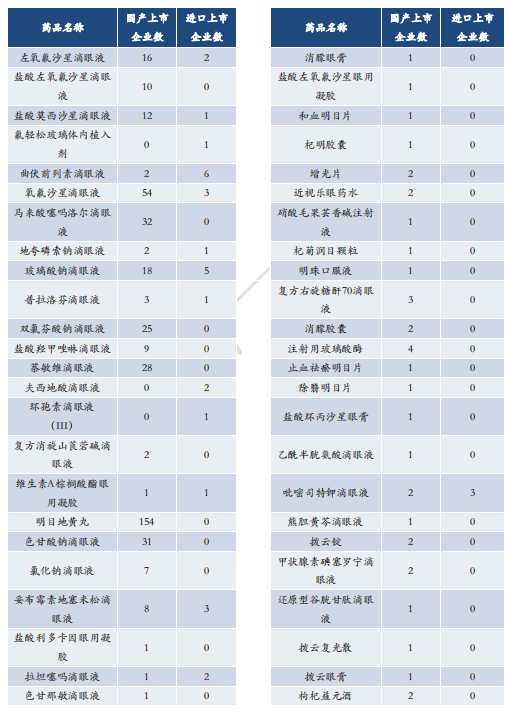 据药融云中国药品批文数据库统计,目前中国上市的眼科用药共326个产品(含化学药和中成药),厂家数量最多的眼科药是明目地黄丸,共有154家厂家。进口厂家数量最多的产品是曲伏前列素滴眼液,共有6家进口厂家,2家国内厂家。