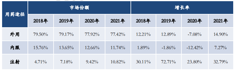 据药融云全国医院全终端数据显示,眼科用药中,外用是最主要的剂型,近几年占比均达到75%以上。但同时也发现,眼科注射剂的规模在逐年增长,占比也在逐年扩大。销售的增长主要贡献来自康柏西普(Conbercept)注射液、阿柏西普注射液和雷珠单抗注射液这3个品种的增长。