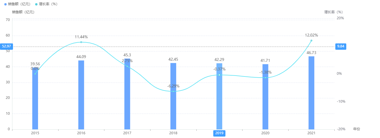 据药融云全国药店零售数据库统计,2021年我国药店零售市场中眼科用药(含化药和中成药)的销售额为46.71亿元,2021年销售收入同比增长 12.02%,增速高于去年同期。 2021 年零售药店中眼科用药的增速,没有跑赢整体用药零售市场增速(17.7%),说明在药品零售销售增长整体提升的市场大环境下,眼科用药在零售药店的销售没有呈现出较强的市场需求。