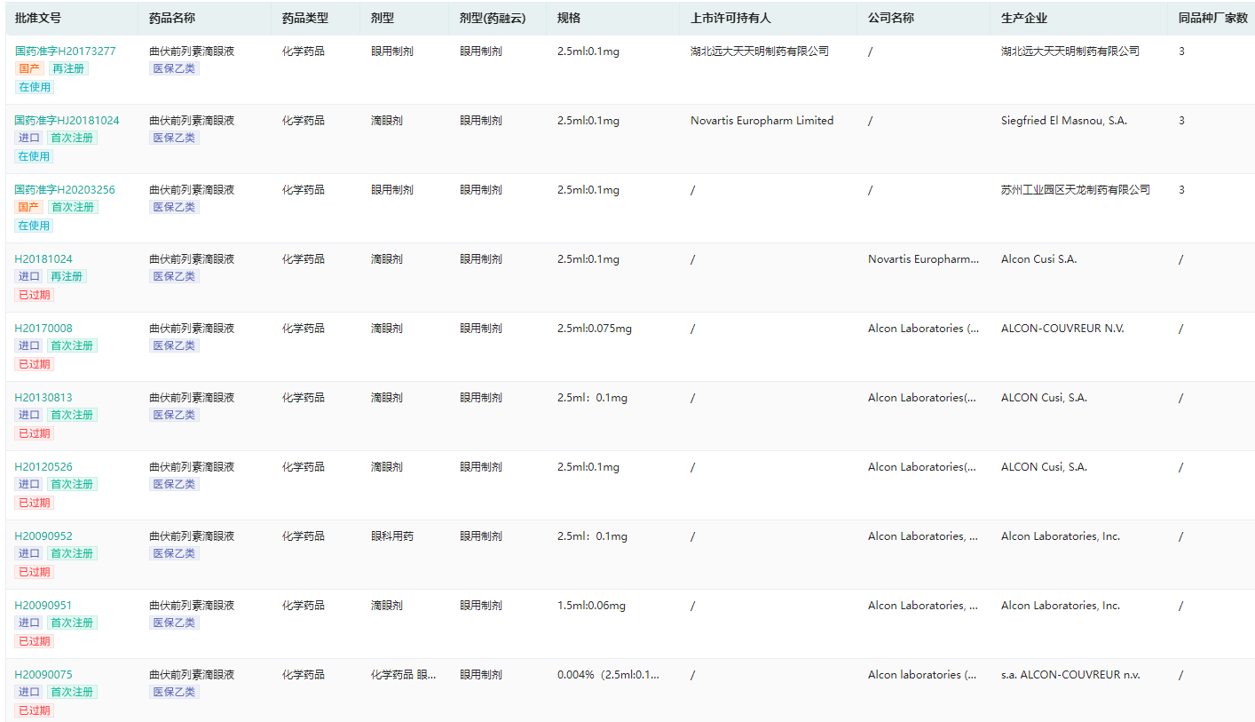 曲伏前列素滴眼液药品批文情况(部分)