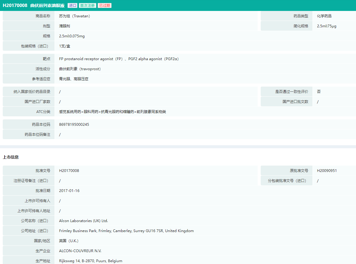 曲伏前列素滴眼液是Alcon Laboratories (UK) Ltd (爱尔康)的重磅医药品种,产品名称为Travatan(苏为坦),适应症为降低成人开角型青光眼或高眼压症患者的眼压。青光眼是威胁人类健康较严重的眼科疾病,持续的高眼压对眼球各部分组织及视功能带来严重损害是全球第二大致盲因素。