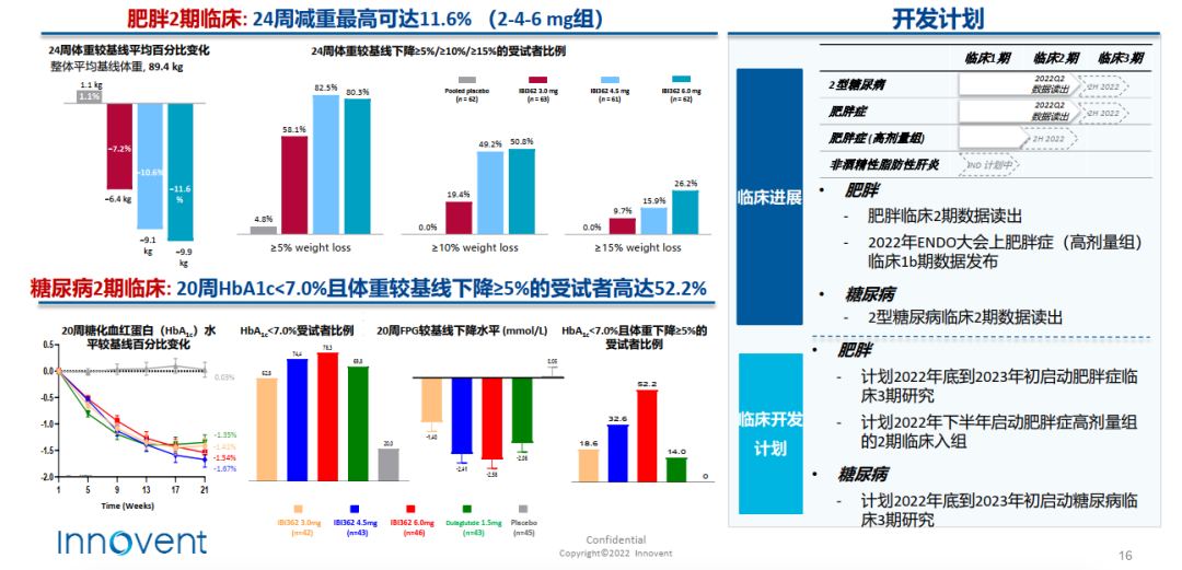2022年9月初,IBI362(mazdutide)在中国肥胖受试者中的II期临床研究高剂量 (9.0 mg) 队列完成首例受试者给药。本研究(ClinicalTrials.gov, NCT04904913)是一项在中国超重或肥胖受试者中评估mazdutide疗效和安全性的随机、双盲、安慰剂对照的II期临床研究。