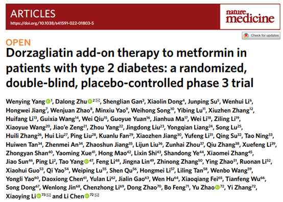 [8] Yang W, Zhu D, Gan S, et al. Dorzagliatin add-on therapy to metformin in patients with type 2 diabetes: a randomized, double-blind, placebo-controlled phase 3 trial[J]. Nature medicine, 2022, 28(5): 974-981.