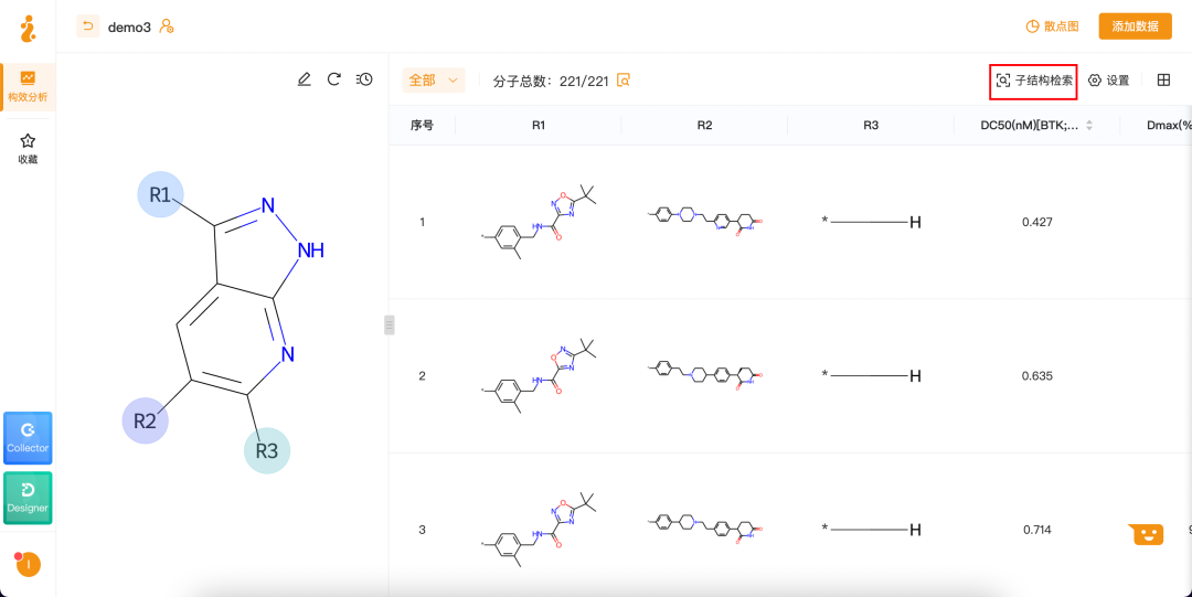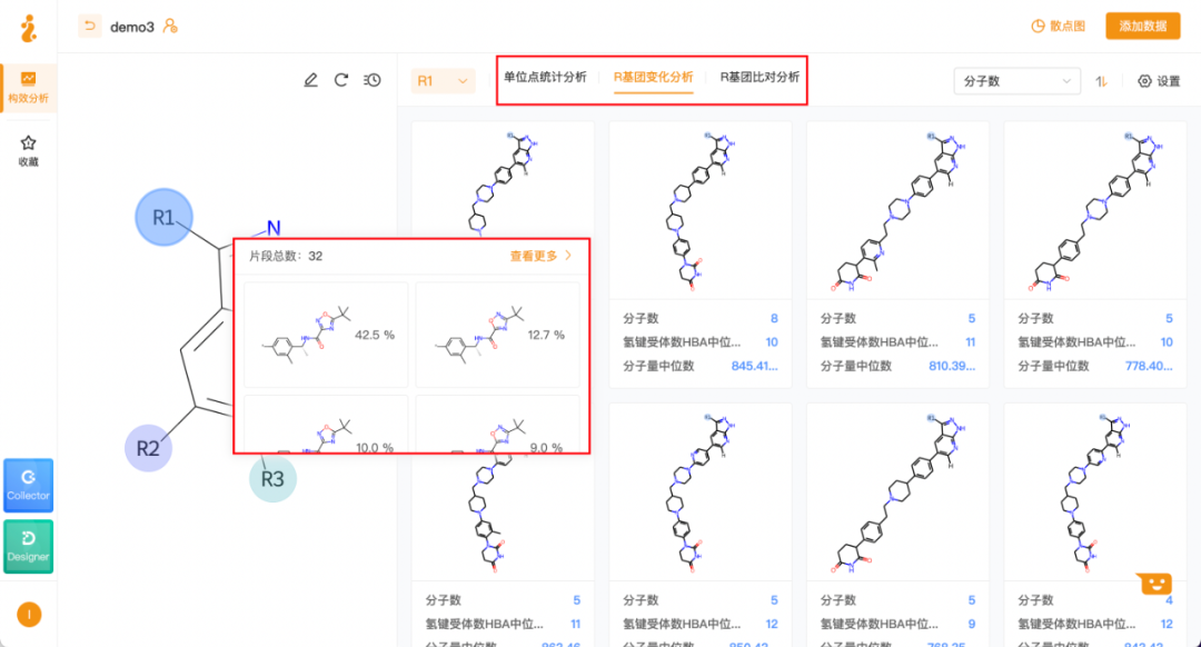通过导入Collector提取出的数据或自行上传相关数据,Inspirer可实时对母核各位置取代基变化情况以及相应的活性、理化性质(CLogP/MW/tPSA)变化情况等指标进行精确、智能化的分析,从而指导化合物的结构设计。