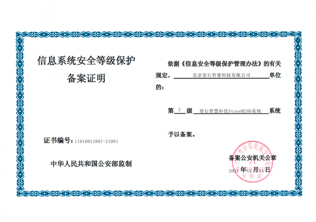 另外,StoneMIND平台也正式通过信息安全等级保护三级的测评,并获得由公安部门核准颁发的信息系统安全等级保护第三级备案证明。这是国家层面有关数据安全最高等级的认证,也是对StoneMIND平台及望石智慧数据安全防护能力的权威认证。