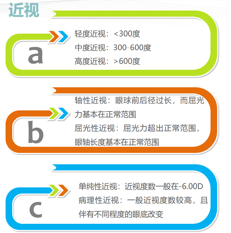 近视是一种屈光不正的现象,当眼在调节放松状态下,平行光线进入眼内,其聚焦在视网膜之前,这导致视网膜上不能形成清晰像,称为近视眼(myopia)。近视在如今是一种很是常见的问题,也是一种因为用眼过度、用眼方式不正确或者是遗传等原因所导致的视力问题。