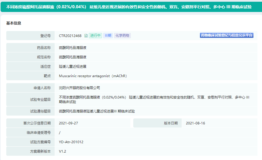 兴齐眼药硫酸阿托品滴眼液临床试验基本信息