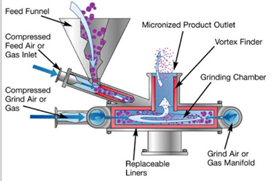 气流粉碎是将净化和干燥的压缩空气通过一定形状的特制喷嘴,形成高速气流,以巨大的动能将带动物料在密闭的粉碎腔体中互相碰撞而产生剧烈的粉碎作用,所需的粒径大小可以通过调节进料压力和粉碎压力、下料速度进行有效控制。经气流粉碎的原料平均粒径小,粉碎粒径范围一般在0.5-20μm,粒度分布窄;且由于压缩空气在喷嘴处绝热膨胀会使系统温度降低,颗粒的粉碎是在低温瞬间完成,尤其适用于低熔点、热敏性原料的粉碎。