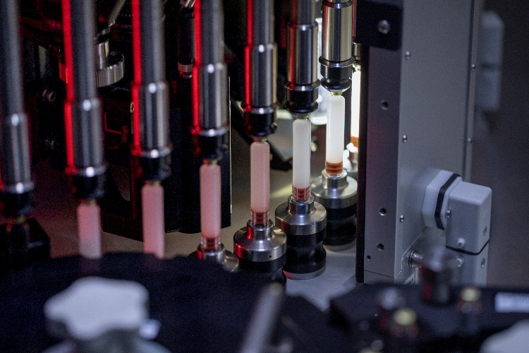 注射器一旦进入检测传送带,将倒置进行检测。可使用带有定制模具的芯轴将注射器上下固定,或者通过两指自适应固定夹具在胶塞下方进行操作。第一种方法,通过固定注射器上部和下部可使用更高的旋转速度。第二种方法,固定夹具不接触闭合机制,因此影响闭合完整性的风险较低。