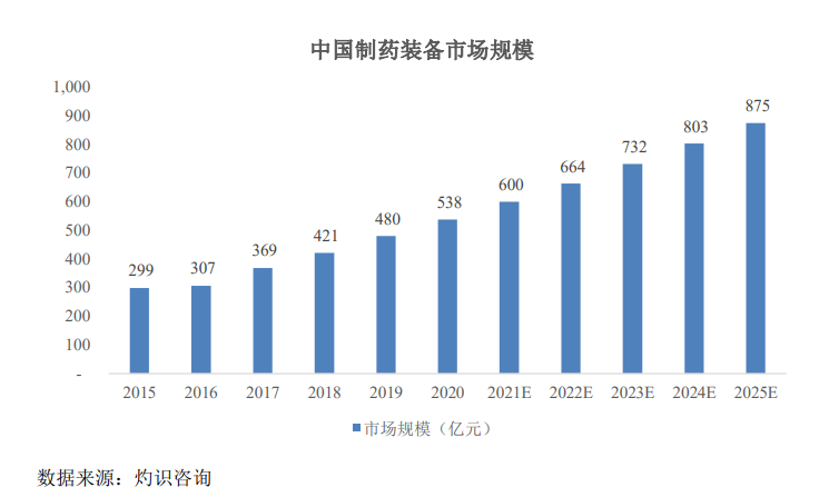 中国制药装备行业在2015年的市场规模约为299亿元,到2020年增长至约538亿元,年复合增长率约为12.47%,预计到2025年,中国制药装备市场规模将达到约875亿元,2020-2025年复合增长率约为10.22%。