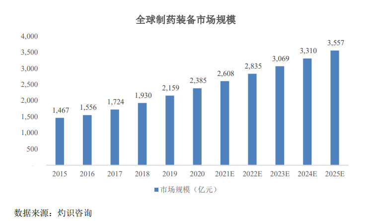 全球制药装备行业在2015年的市场规模约为1,467亿元,到2020年增长至约2,385亿元,年复合增长率约为10.21%,预计到2025年,全球制药装备市场规模将达到约3,557亿元,2020-2025年复合增长率约为8.32%。