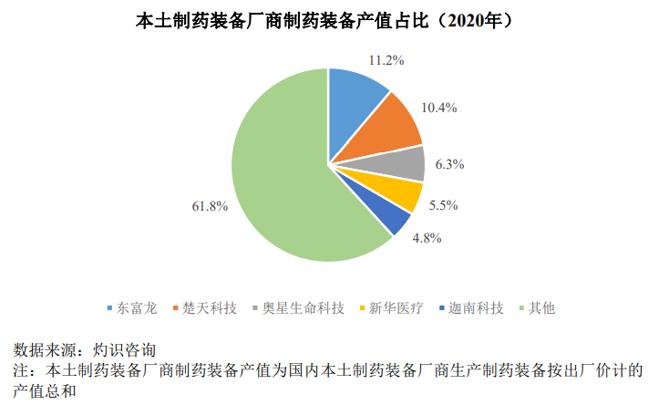 2020年国内本土制药装备厂商制药装备产值规模约为194亿元,从上图市场竞争格局可以看出,国产制药装备市场比较分散,竞争较激烈,只有东富龙和楚天科技产值占比超过10%,分别为11.2%和10.4%。随着行业的发展和技术的进步,国产制药装备产值将继续扩大;同时在品牌效应和规模效应影响下,市场集中度将进一步提升。