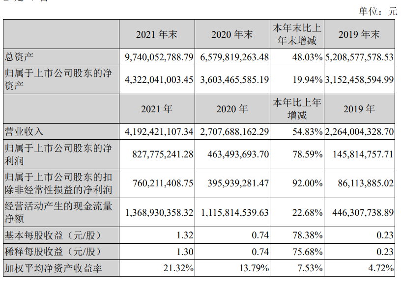 2022年4月8日,东富龙发布2021年年度报告。报告显示,2021全年东富龙实现营收41.9亿元,同比增长54.83%;实现归属于上市公司股东的净利润8.3亿元,较2020年增长78.59%;加权平均净资产收益率达21.32%,同比增长7.53%。
