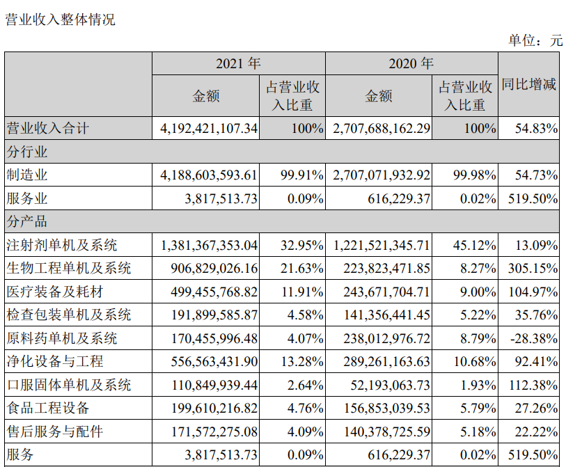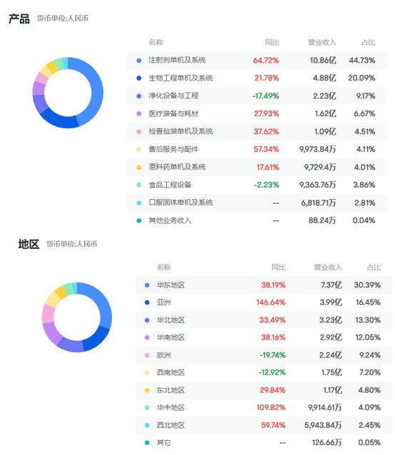 1.从产品分类来看,注射剂单机及系统营收金额最高,为13.8亿元,占营业收入比重为32.95%,同比增长13.09%,其次是生物工程单机及系统(实现营收9.1亿元)、医疗装备及耗材(实现营收4.9亿元)。