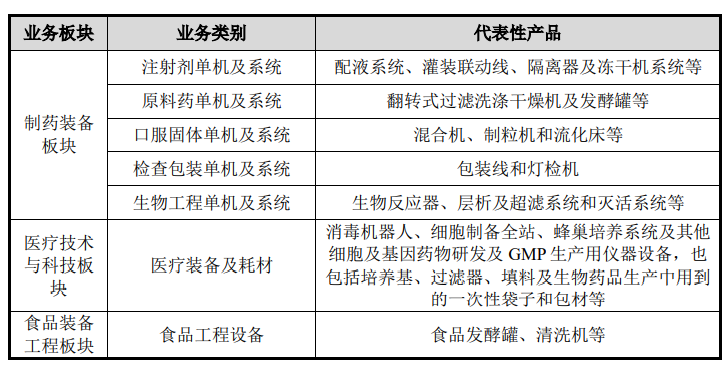 主要为制药企业提供非标定制化的制药系统设备及一站式整体解决方案,业务领域涵盖化学小分子药和生物大分子药。东富龙提供的产品和解决方案基本覆盖药品生产的全流程,包括药厂原料药解决方案(化学药合成、中药提取、生物大分子原液)和制剂解决方案(注射剂、固体制剂)、检查包装、机电安装、净化空调系统、文件验证、自动化和信息化软件、厂房设计等。东富龙制药装备板块的产品和解决方案广泛应用于疫苗、血制品、抗体、抗生素、化学药品、诊断制剂、保健品、中药西制等药物制造领域。