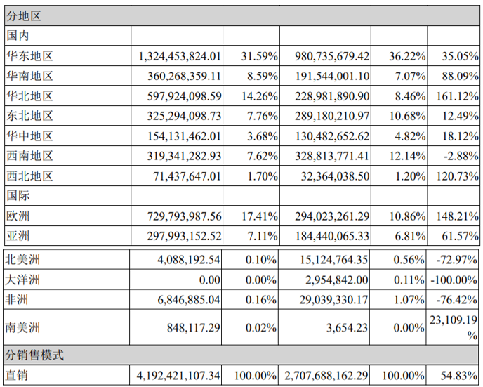 2.从市场分布来看,在国内,华东是主要市场地区,实现营收13亿元,华东、华南以及华北为前三大市场地区,来自这三个市场的营收占总营收比重为54%。国外地区,欧洲是主要市场,营收7.3亿元,占总营收比重17.4%。