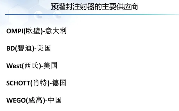 由于对用药安全性(降低被锐器损伤风险)、便利性(使用时直接注射,省时省力,能够减轻医护人员工作量)、降低交叉污染风险、提高剂量准确性的需求提高,预灌封注射器药物递送系统正在快速兴起。当前而言,其他超级重磅新药也使用的有:来自默沙东的4/9价HPV疫苗佳达修、 辉瑞的13价肺炎球菌多糖结合疫苗沛儿、拜耳/再生元的阿柏西普、诺华/罗氏的雷珠单抗、罗氏的托珠单抗雅美罗、诺华/罗氏基因泰克的奥马珠单抗等等。