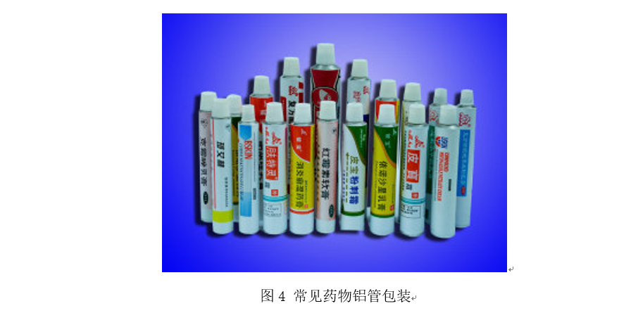 软质铝管是经过软化处理,用于乳膏剂、软膏剂、凝胶剂等制剂的包装容器。目前使用的多为第三代铝管,第三代铝管经内部涂膜,薄顶封膜和尾涂层,其密封性、安全性均有较大提高。常见药物用铝管见图4。