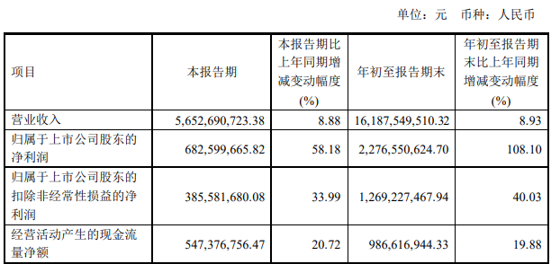 人福医药10月27日发布公告,公司第三季度实现营业收入56.53亿元,同比增长8.88%;净利润6.83亿元,同比增长58.18%。前三季度实现净利润22.77亿元,同比增长108.1%,前三季度,公司核心医药产品保持稳定增长;汇率波动导致汇兑收益增加约1.69亿元;出售天风证券等的股权形成处置损益以及收回控股股东资金占用利息,形成非经常性损益约10.36亿元。