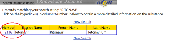 第四步,在弹出以下的界面中,点击链接序号进入,有时会出现多个选择项,需要确认正确的药品名称,如需重新搜索可以点击“New Search”。
