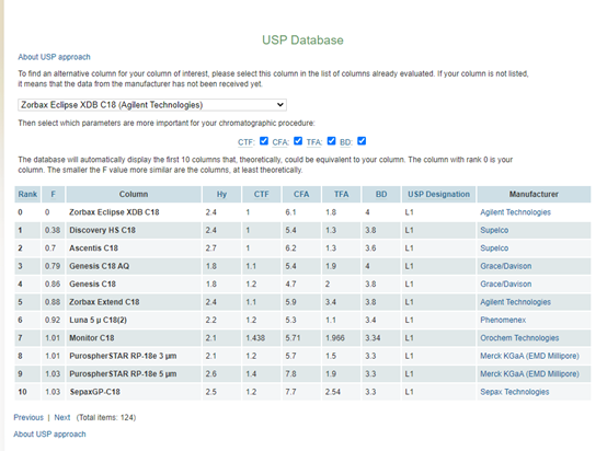 如果有没有类似的色谱柱可以替换,但是项目又比较紧急呢?USP给出了一个色谱柱性能差异的网站,我们可以在这个网站上查询我们是否有类似的色谱柱,具体的查询方式如下: