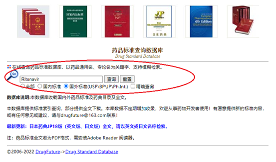 第二步,进入“药品标准查询数据库”主页,并在查询框输入你需要查询品种英文名称,以Ritonavir (利托那韦)为例。同时勾选“国外标准(USP\BP\JP\Ph.Int.)”选项框,点击查询。