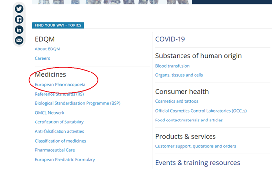 第一步,登陆EDQM的官网,“https://www.edqm.eu/”(可以百度EDQM),首页下选择“Medicines”“European Pharmacopoeia”。