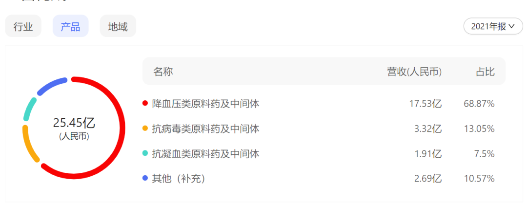在市场需求和公司战略的双重作用下,天宇股份2017年降血压类原料药及中间体产品实现营收8.13亿元,2018年增长至10.9亿元,2019年猛增至18.27亿元,2020年持续发力实现营收22.78亿元,2021年有所降低,营收17.53亿元。近五年来,降血压类原料药及中间体产品一直为该公司贡献七成以上的营收,甚至在2019年、2020年接近九成。可以说,降血压类原料药及中间体产品撑起了天宇股份这座宏伟大厦。