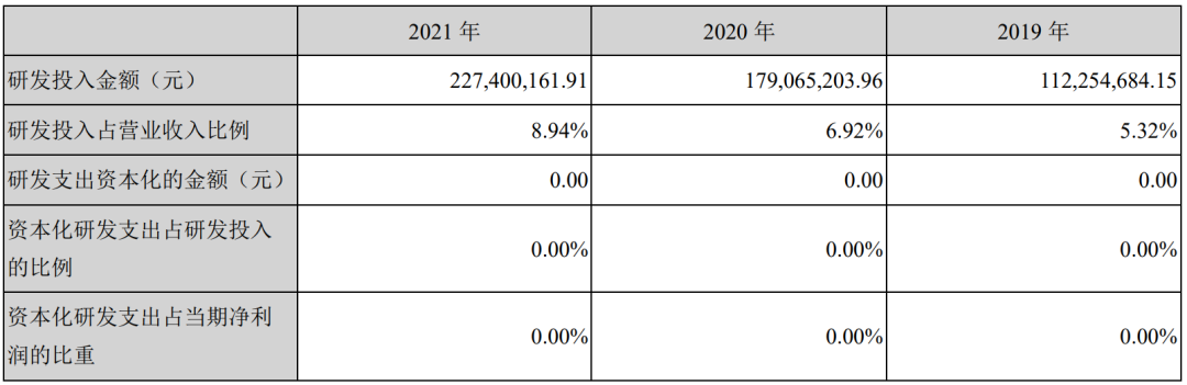 近三年天宇股份公司研发投入金额及研发投入占营业收入比例从2019年到2021年均逐年增多,占营业收入的比例也逐年增长,2021年研发投入达到了2亿多元,研发投入占营业收入比例达到8.94%。