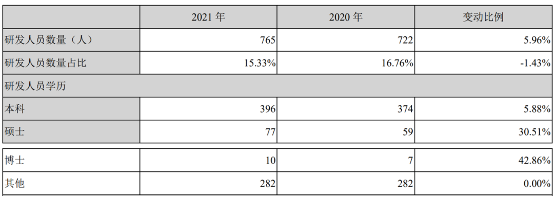 从公司研发人员年龄构成信息看,2020年到2021年30岁以下人员由462人增加到502人,30-40岁人员由209人增长到219人。无论是2020年还是2021年,30岁以下人员都超过半数。