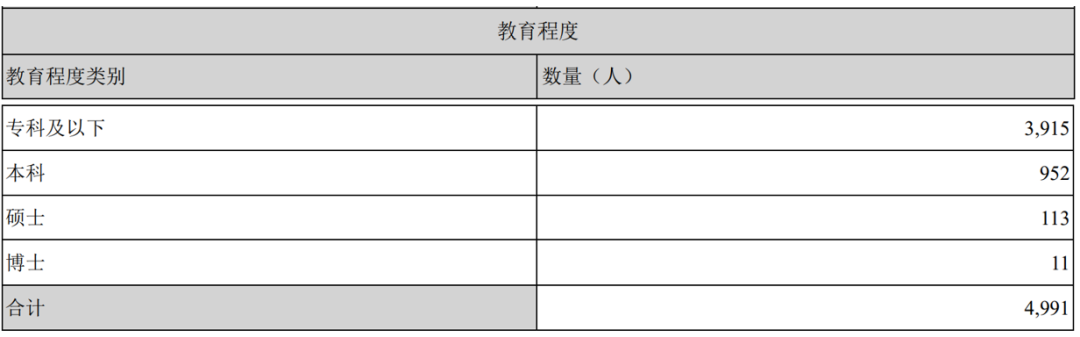 天宇股份公司员工学历为专科以下的人数最多,一共3915人,本科、硕士和博士分别952人、113人和11人。